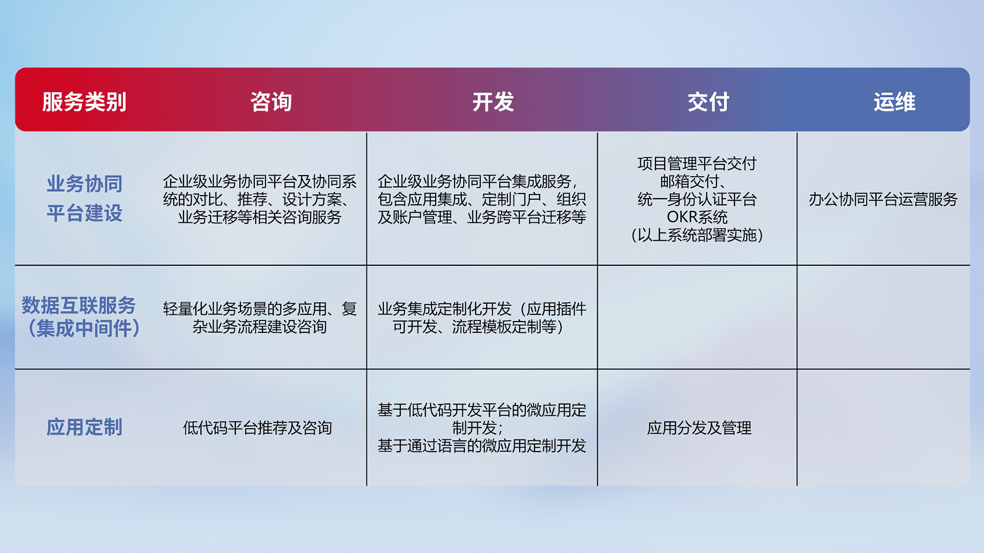 针对钉钉、、企微、、、IDaas等平台级产品提供产品的规划、、方案、、、、交付、、、、定制化开发等服务,,实现如统一协同办公、、、、智能客户服务、、、混合会议管理、、、智能数据查询、、等业务场景,,,,实现数字化转型。。。